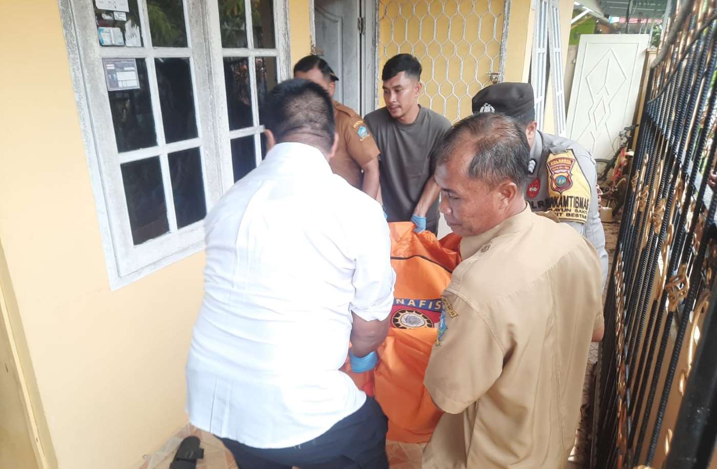 Petugas kepolisian Polsek Bukit Bestari dan masyarakat mengevakuasi korban di dalam rumahnya, Senin (13/10/2025). (F-Mala)