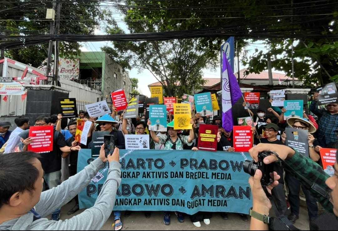 Jakarta (SN) – Aliansi Jurnalis Independen (AJI) Jakarta bersama koalisi masyarakat sipil menggelar aksi protes di Pengadilan Negeri Jakarta Selatan, Senin, 3 November 2025. Aksi solidaritas ini merupakan dukungan terhadap TEMPO yang sedang digugat secara perdata oleh Menteri Pertanian Amran Sulaiman, sebagai pejabat publik dan pembantu presiden.