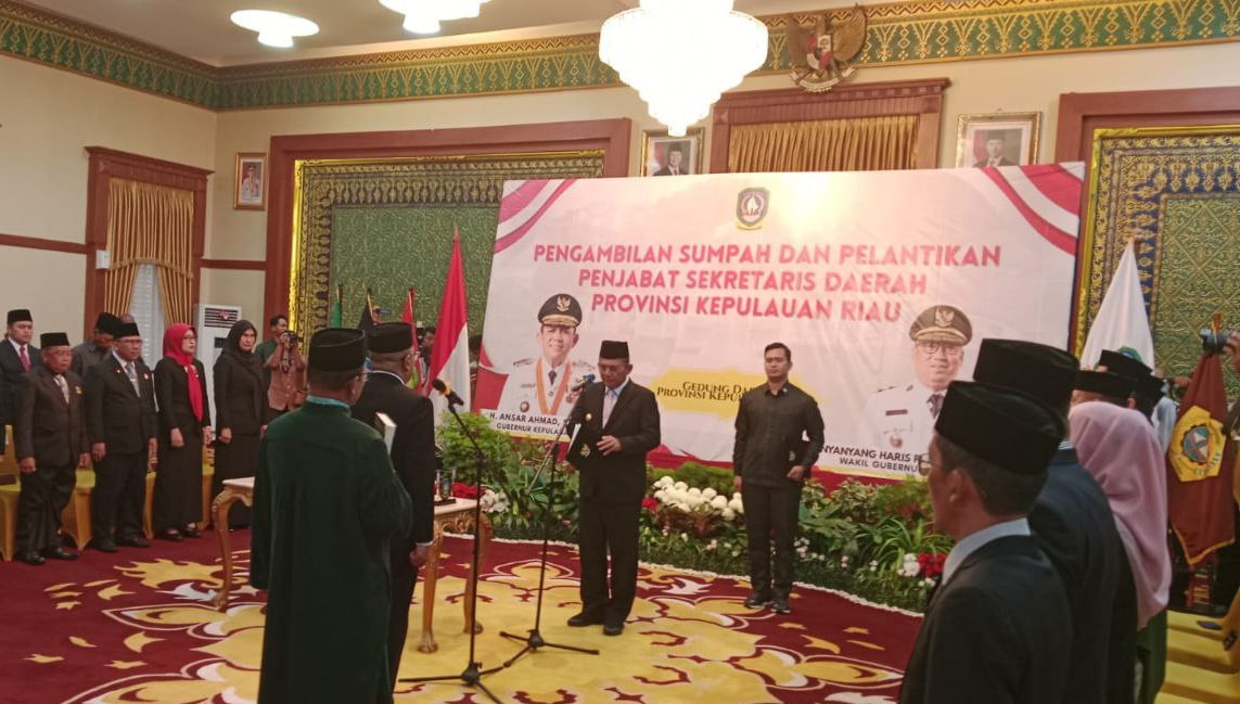 Gubernur Kepri, Ansar Ahmad saat melantik Asisten II Setdaprov Kepri, Luki Zaiman Prawira sebagai Pj Sekdaprov Kepri, Rabu (5/11/2025).(Foto: zulfikar-sketsanews.id)