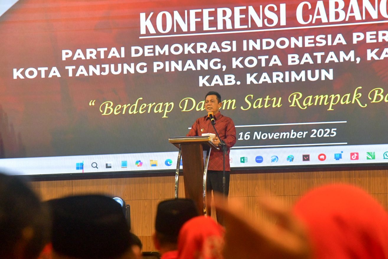 Gubernur Kepri H. Ansar Ahmad menghadiri acara Pembukaan Konferensi Daerah (Konferda) dan Konferensi Cabang (Konfercab) PDIP Kepulauan Riau yang digelar di Ballroom Hotel Aston Pelita, Kota Batam, Minggu (16/11/25). (F-Diskominfo kepri)