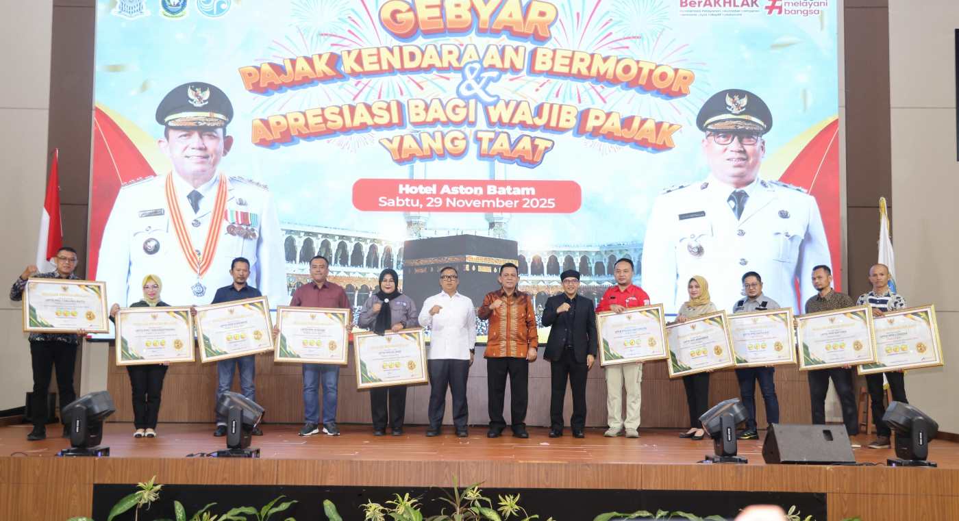 Gubernur Kepri, Ansar Ahmad bersama Wakil Gubernur Nyanyang Haris Pratamura hadir langsung untuk menyerahkan apresiasi Program Gebyar Pajak Kendaraan Bermotor (PKB) Provinsi Kepri Tahun 2025, di Ballroom Aston Hotel & Residence Pelita, Kota Batam, Sabtu (29/11/2025). (F-Diskominfo Kepri)